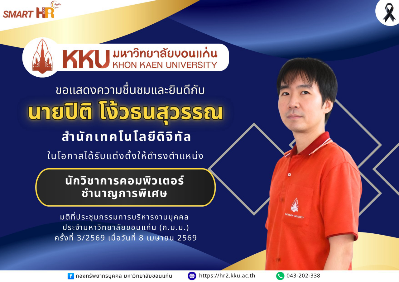 ขอแสดงความยินดีกับนายปิติ โง้วธรสุวรณ ที่ได้รับแต่งตั้งให้ดำรงตำแหน่งนักวิชาการคอมพิวเตอร์ชำนาญการพิเศษ